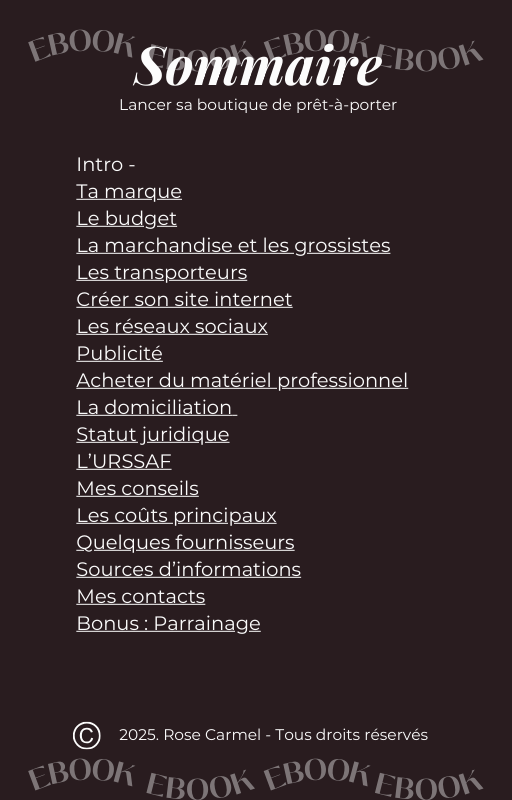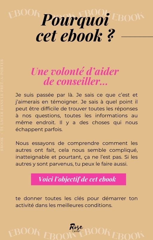 +80 pages rédigées avec amour et sur plusieurs mois qui te donneront toutes les informations INDISPENSABLES pour pouvoir lancer sa boutique en ligne de prêt-à-porter. Comment trouver des fournisseurs ? Qu’est-ce-que l’URSSAF ? Comment créer son site internet ? Où trouver de l’aide ? . Ce sont des informations UTILES qu’il te faudra impérativement pour te lancer. Cet ebook est un véritable gain de temps pour toi si tu souhaites lancer sa boutique en ligne et manque cruellement de réponses à tes questions.