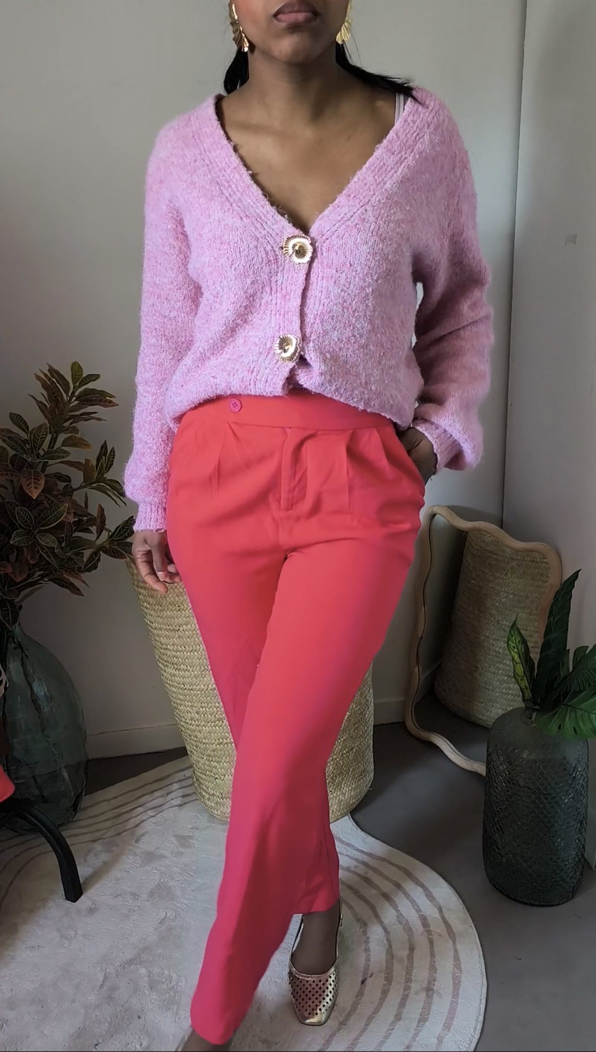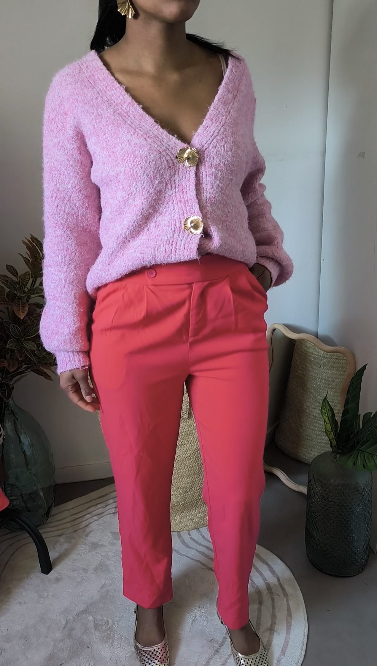 Cardigan rose à boutons dorés – doux et réconfortant